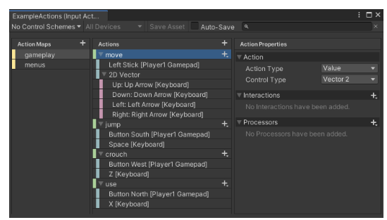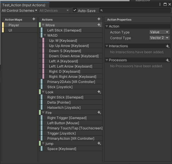 위의 player Input에서 디바이스 입력을 설정한다. 키보드 뿐만 아니라 게임패드, 모바일 등 다양한 디바이스의 입력을 관리할 수 있다. 확실히 GUI 상으로 입력들을 관리할 수 있는 게 전보다 좋은 점 같다.