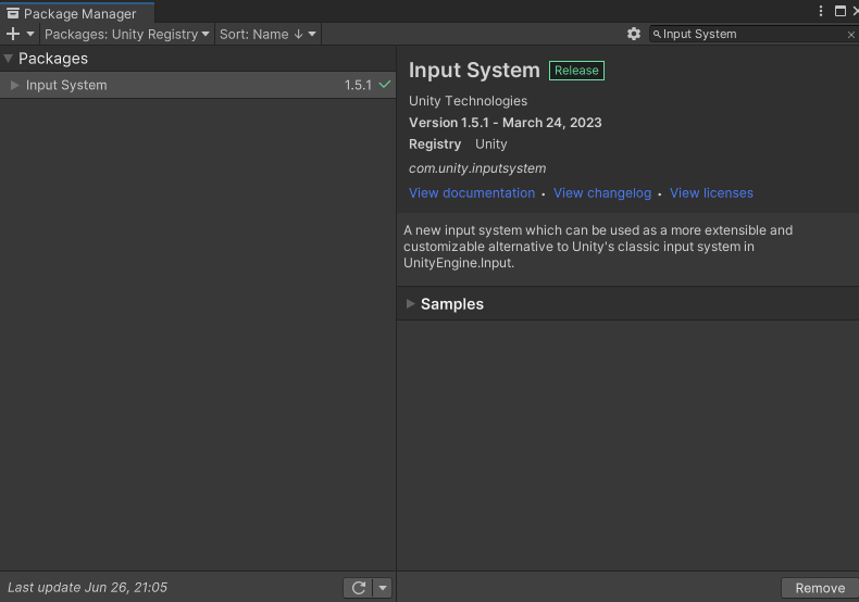 2. 좌측상단에 '+' 오른쪽의 설정을 Packages: Unity Registry' 로 변경, 검색창에 Input System 검색