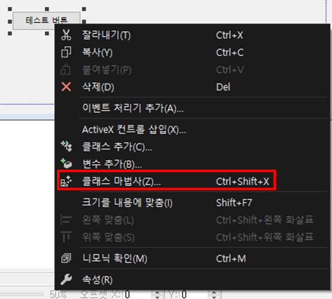 2. 생성한 버튼 누르고 클래스 마법사 선택
