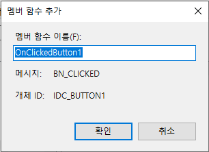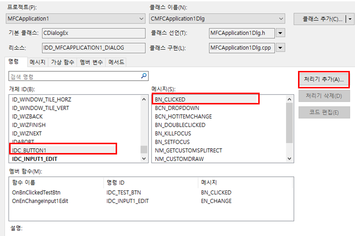 3. 생성한 버튼 ID 확인하고 메시지는 'BN_CLICKED' 선택 (해당 버튼을 클릭했을 때 함수를 실행시키겠다는 메시지임.)