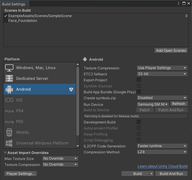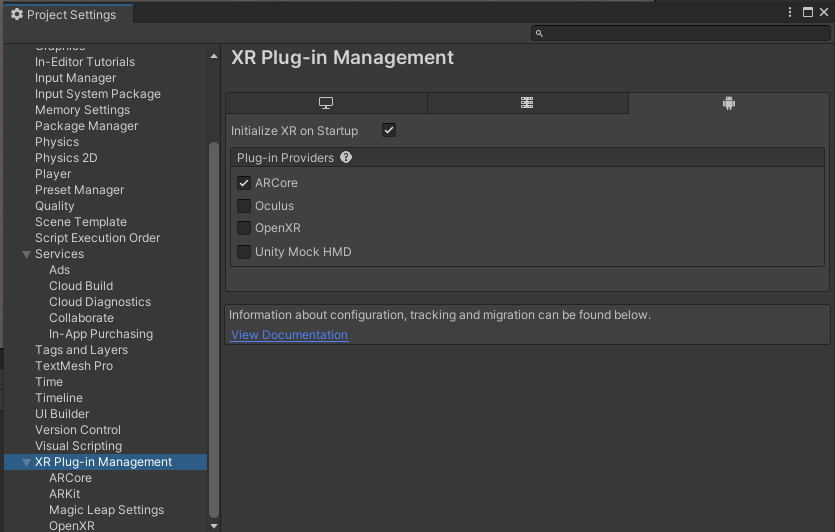XR Plug-in Management 메뉴의 안드로이드 설정에 들어가서 'ARCore' 체크박스를 활성화하자.