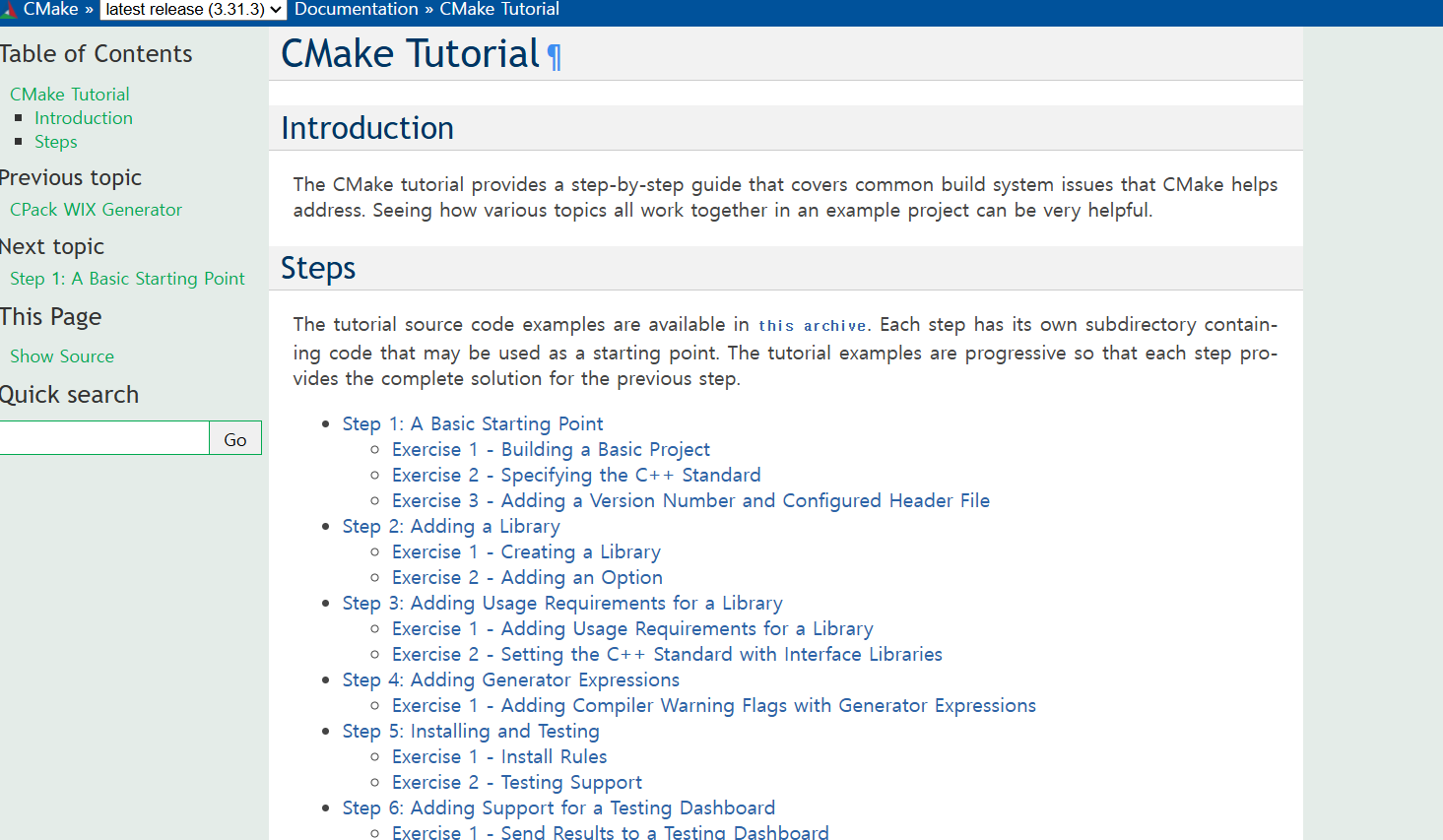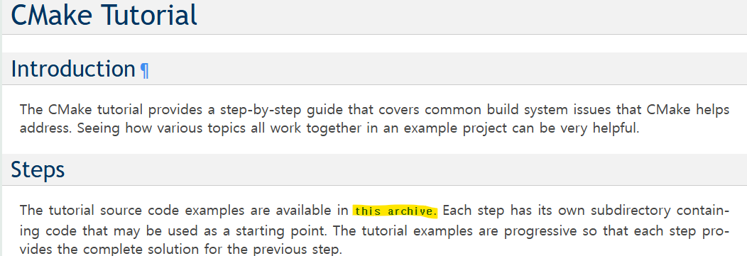 CMake 튜토리얼 예제 소스파일은 메인 페이지의 'Steps' 중제목의 'this archive' 라는 파란색 단어를 클릭하면 .zip 파일로 다운로드 받을 수 있다.