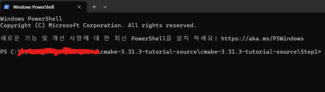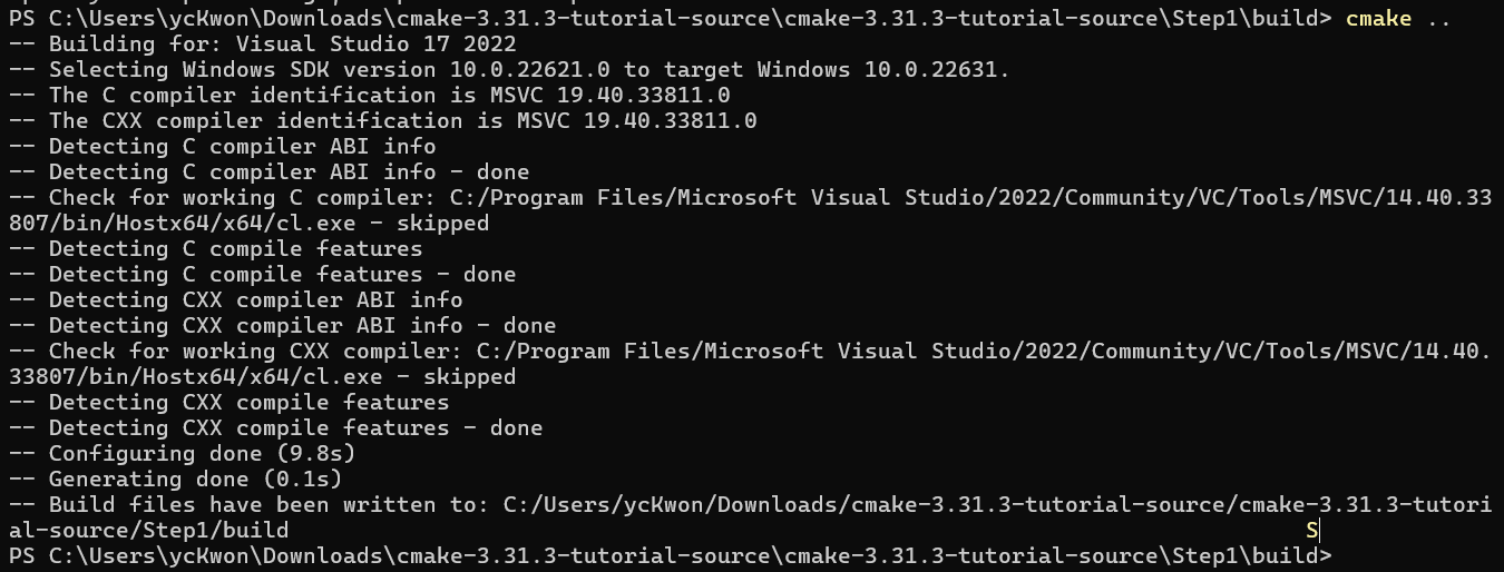 튜토리얼 문서에서는 'cmake ../Step1' 이라고 명시되어 있지만 필자가 했을 때, 프롬프트 상에서 cmake가 작동하지 않았다. 그 대신 아래와 같은 코드로 cmake를 정상적으로 작동시킬 수 있었다.