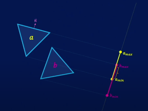 위 이미지에서는 a 도형과 b 도형을 하나의 Axis에 투영 시켰을 때 겹치는 구간이 발생하는 것을 알 수 있다.