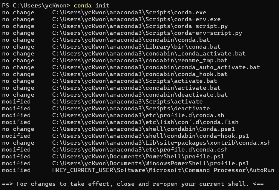 설치한 가상 환경을 실행시키기 위해서 아나콘다 초기 설정을 해주어야 한다. 커맨드는 아래와 같다.